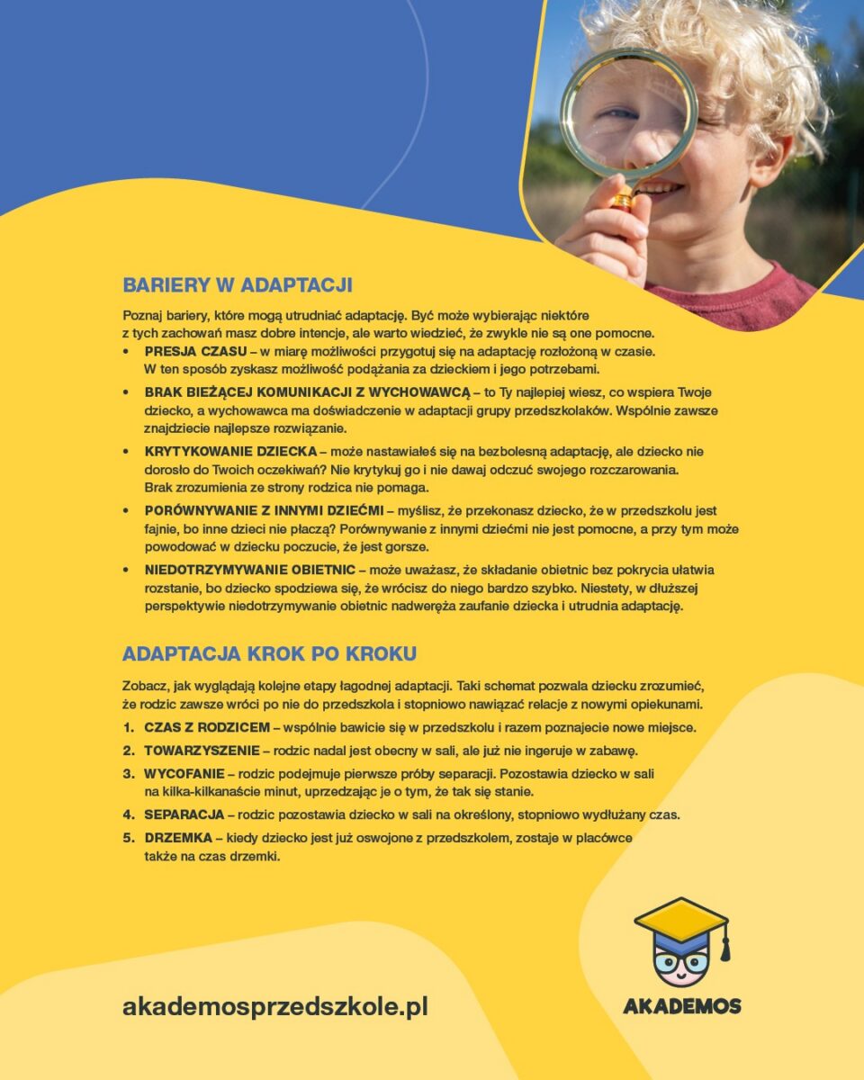 wielu z Was z ekscytacją, ale też z pewnym niepokojem wyczekuje jutra, kiedy to Wasze Pociechy po praz pierwszy przekroczą próg żłobka lub przedszkola Rozumiemy, że pierwsza tak długa rozłąka może budzić napięcie, ale uspokajamy - ten stres można zredukować przygotowując dziecko i siebie do nowego etapu w życiu . Poniżej przedstawiamy kilka praktycznych wskazówek. Co najważniejsze drogi Rodzicu zapamiętaj proszę, że Dziecko bezbłędnie odczytuje Twoje emocje więc jeśli Ty będziesz niespokojny, to Twoje Dziecko również . Dlatego prosimy, weźcie głęboki oddech i pozwólcie swojemu dziecku z ufnością otwierać się na świat. Na miejscu czekać na Was będzie doświadczona kadra. Zacznijmy tą piękną przygodę z uśmiechem ponieważ pierwszy dzień w żłobku czy przedszkolu to jeden z ważniejszych dni w życiu Waszego dziecka.